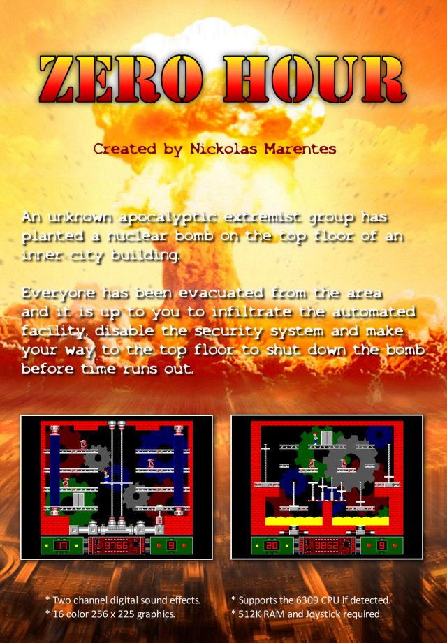 Zero Hour is unique to other games I have created in that it has no scoring. The game is a mashup of game genres. It's a platform game with a few puzzle elements and a sense of adventure thrown in.
